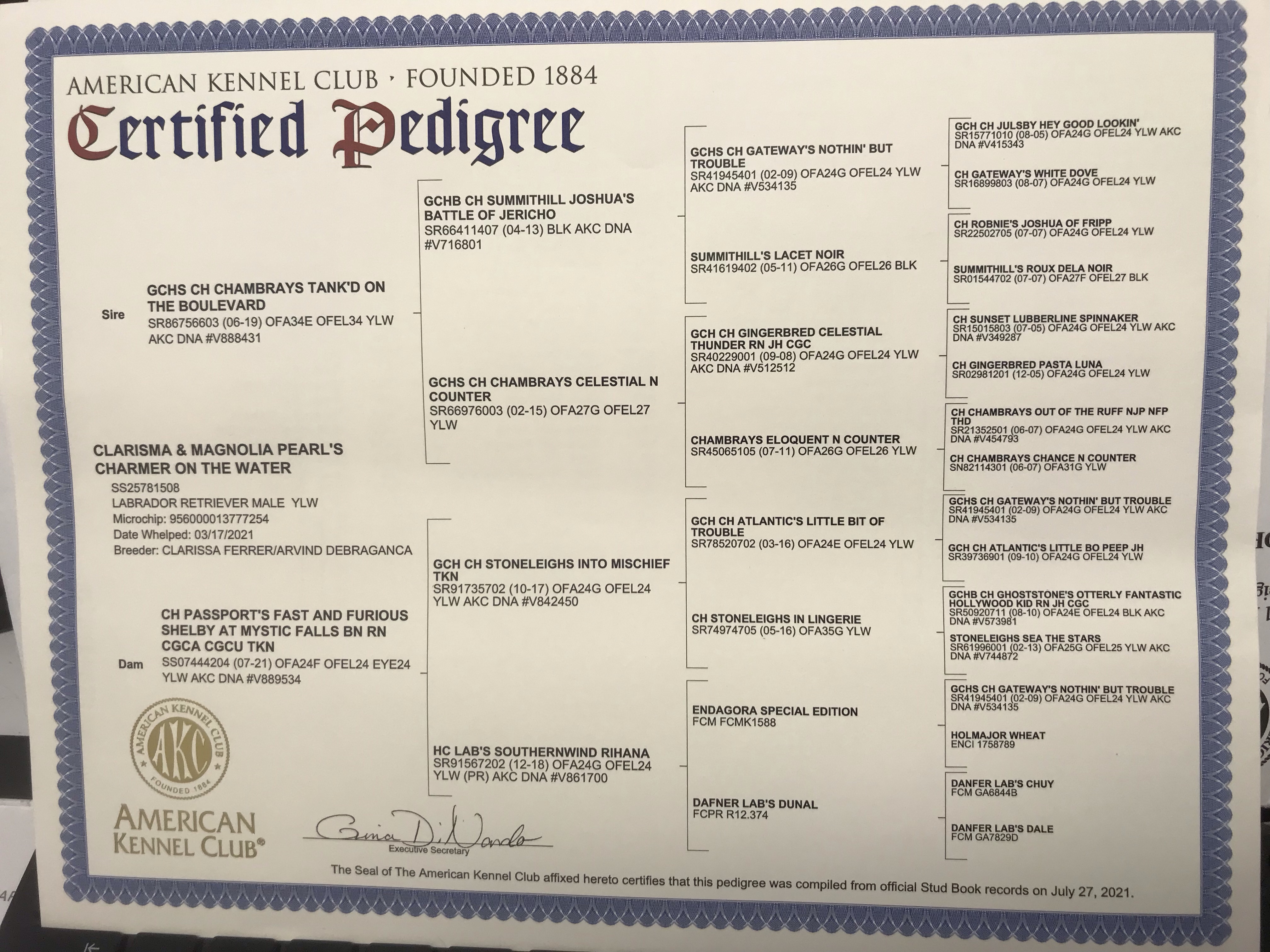 Decoy has a special place in our hearts. When Magnolia Pearl Retrievers met Decoy’s mom (Shelby), we fell in love with her personality, temperament, and look. When we heard that she was expecting a litter, we knew then and there that a puppy from the litter was in the cards for us. We have big plans for Decoy’s future to include Conformation, Dock Diving, Fast Cats, and so much more!